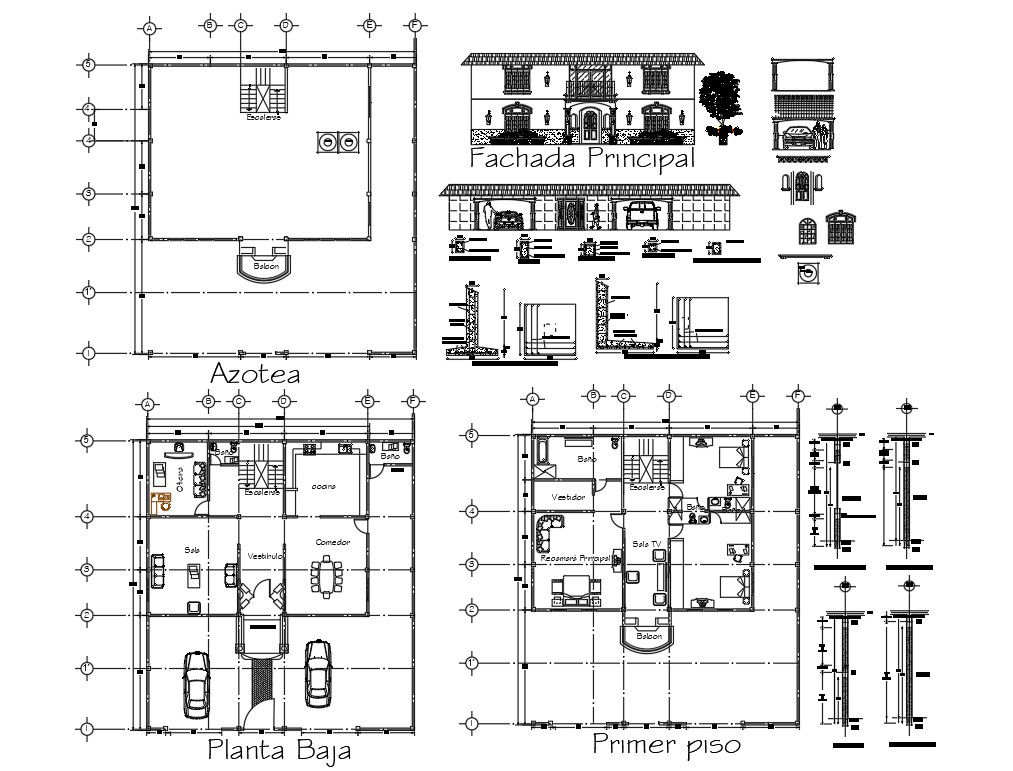 Modern House details providing a layout plan, elevation details , door and window details , parking area, kitchen,
