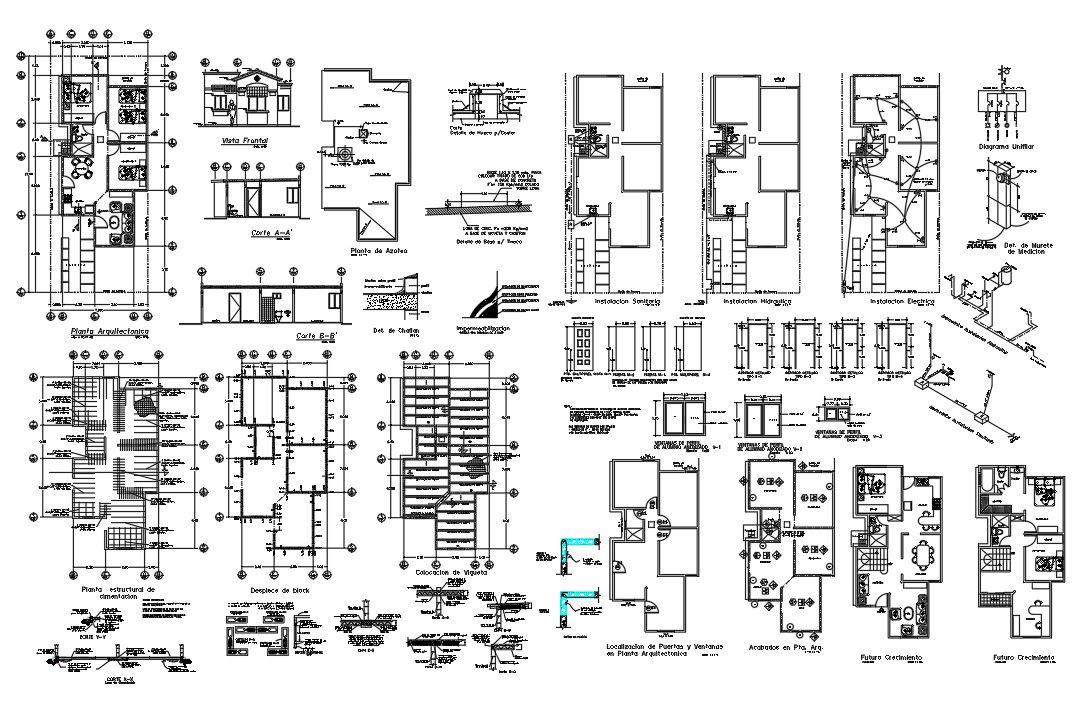 Lay-out of house details in a layout plan, electrical details , section plan, foundation details , Detailed base for water tank, beam details, wooden details