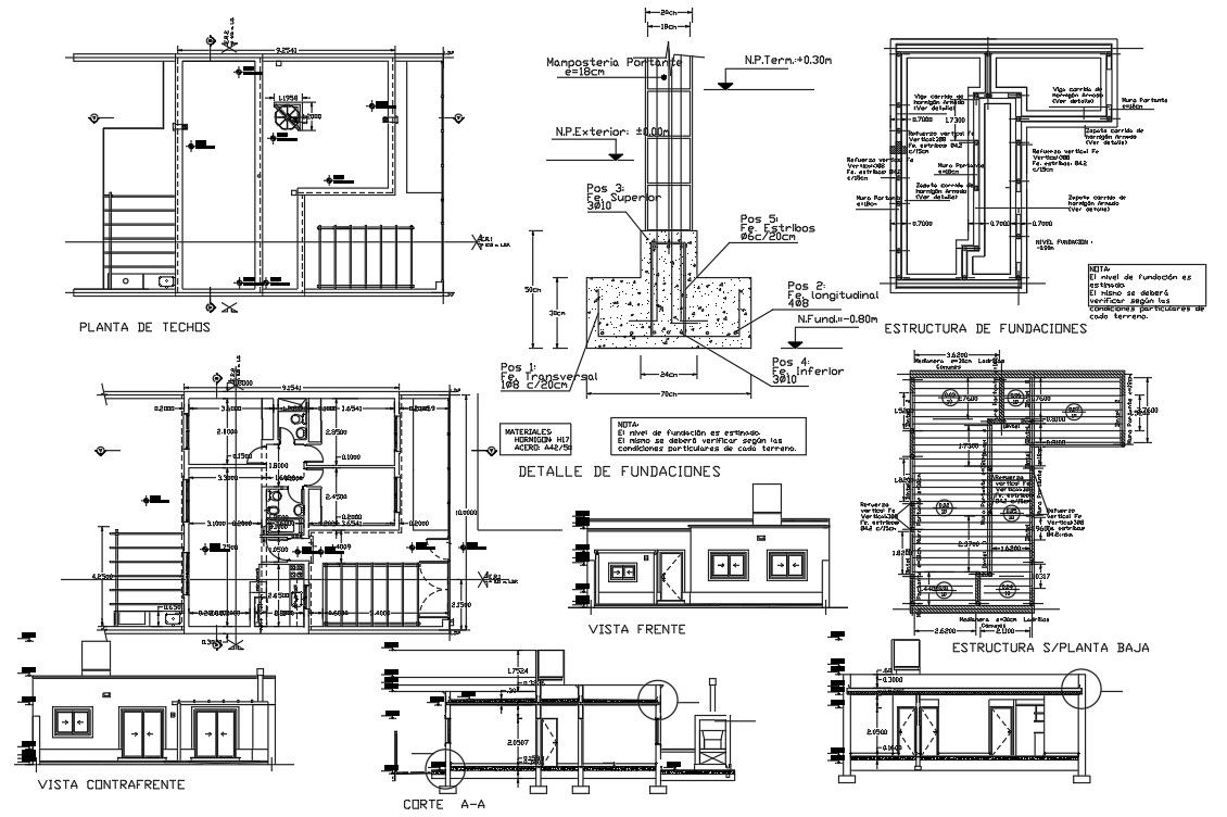 Master bedroom details including a front view, section plan, toilet and bathroom, Zapata run reinforced concrete,