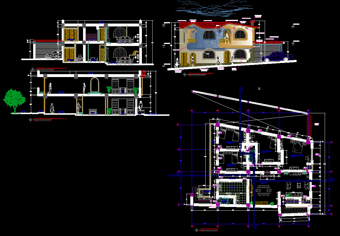 This modern home AutoCAD DWG file provides a complete architectural drawing set for residential design projects. The layout includes precisely detailed floor plans, sectional drawings, and elevation views that showcase both structure and style. Each level of the house is carefully designed, highlighting the spatial arrangement of living rooms, bedrooms, kitchen, and service areas. The sections in this drawing clearly illustrate vertical dimensions, levels, and spatial organization for better visualization during construction.
