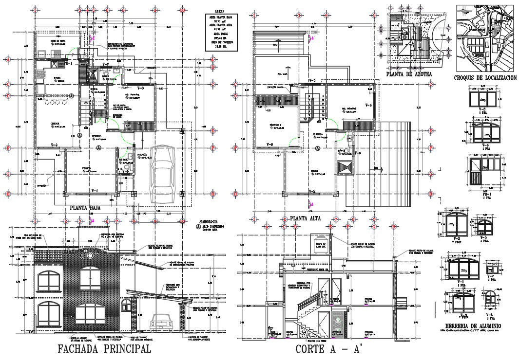 Family House Detail in elevation plan, layout details, localization map, wooden door and window details , parking area, kitchen, bedroom, store room.