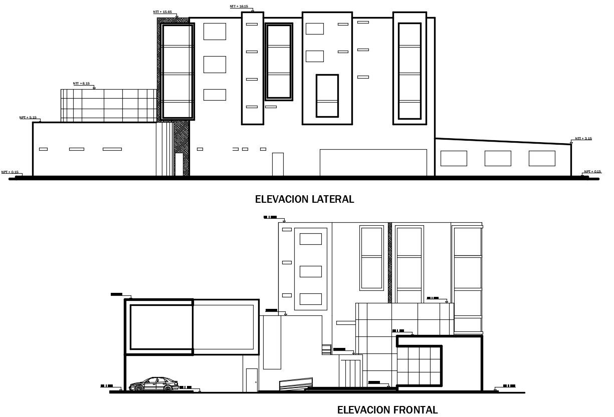 2d CAD elevation drawings details of building apartment dwg file that shows building different sides of elevation like front elevation and rear elevation is shown in drawings with floor level details and leveling door window blocks details also included in drawing.