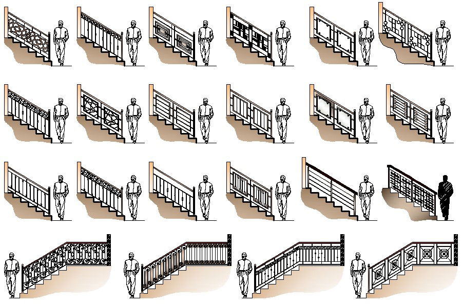 Model of staircase design dwg file that shows stairway railing design along with riser tread details.