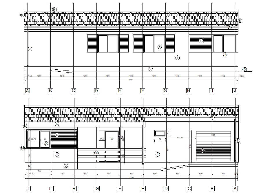 Elevation of house drawings dwg file that shows different sides of elevation of house like front elevation and rear elevation along with door window blocks details and roofing structure details at ceiling.