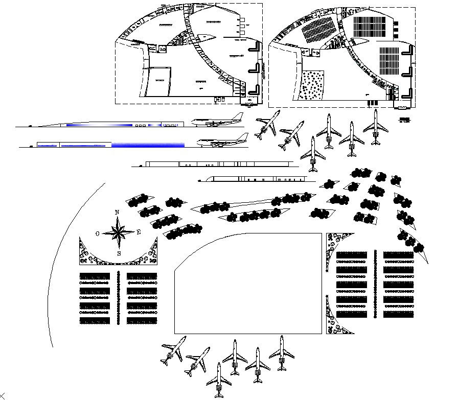 International airport design dwg file that shows airport terminal building floor plan details along with taxi-way details runway, airplane, runway marking signs, airport parking system, terminal building amenities and facility details also included in drawings.
