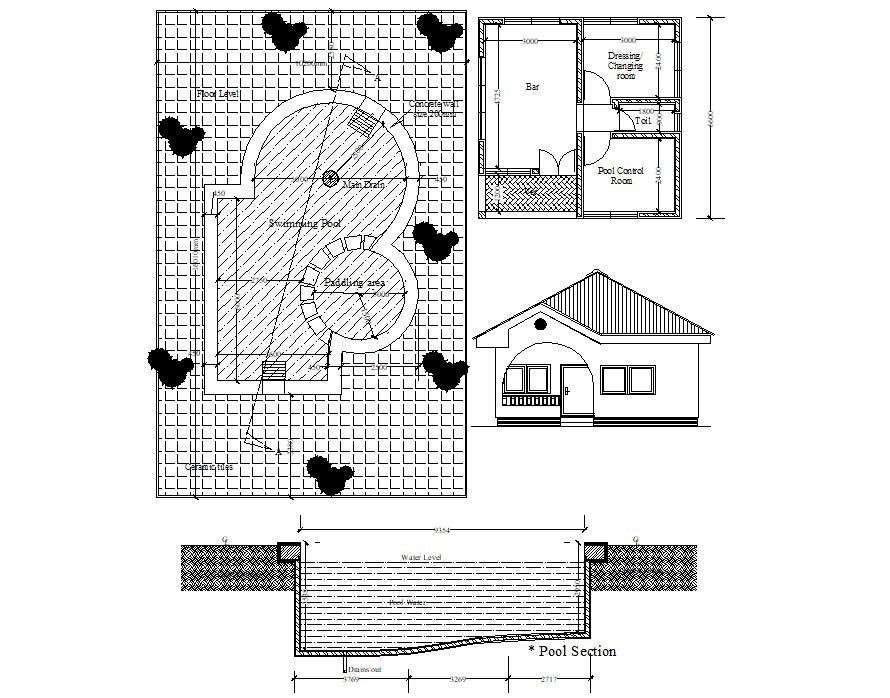 Detail of Pool house plan autocad drawing that shows swimming pool design details along with pool house plan and elevation details. Normal pool level, water level details, pool section details also included in drawings.