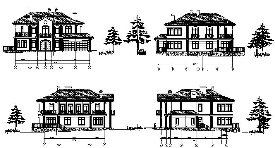Residential bungalow project dwg file that shows different sides of elevation of house like front elevation, side elevation and rear elevation. Floor level details with balcony parking space details also included in drawing.