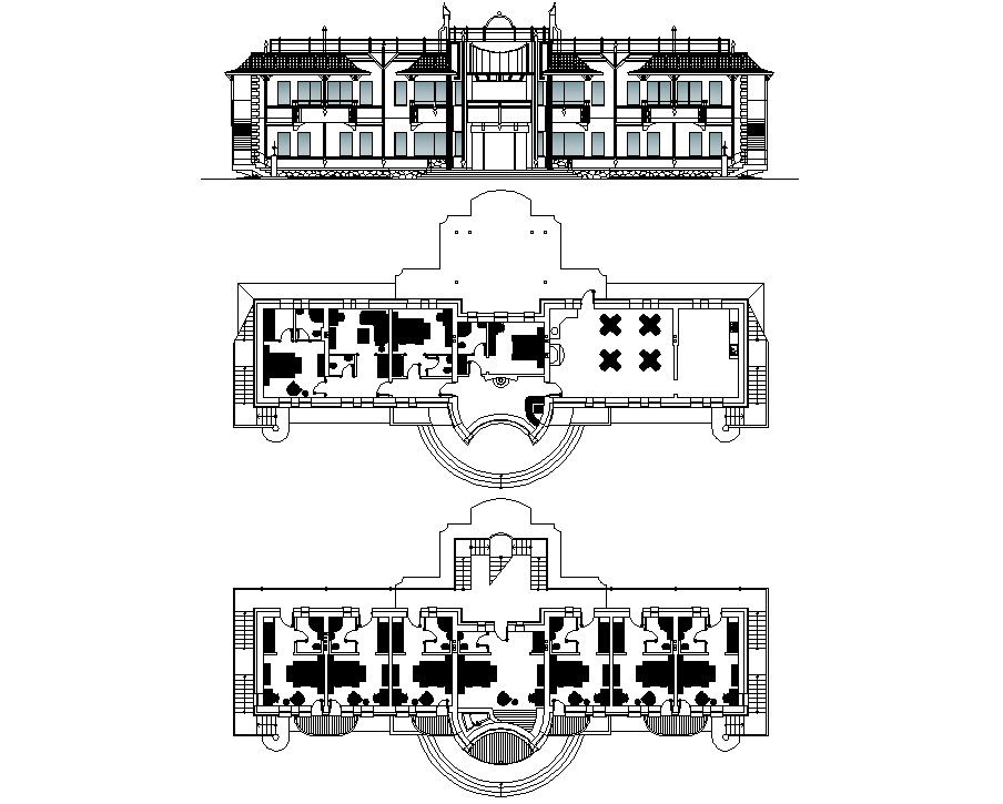 Hotel building design layout plan that shows work plan drawings details of hotel building with furniture layout details in building and floor level details. Building front elevation dials door window blocks details also included in drawings.