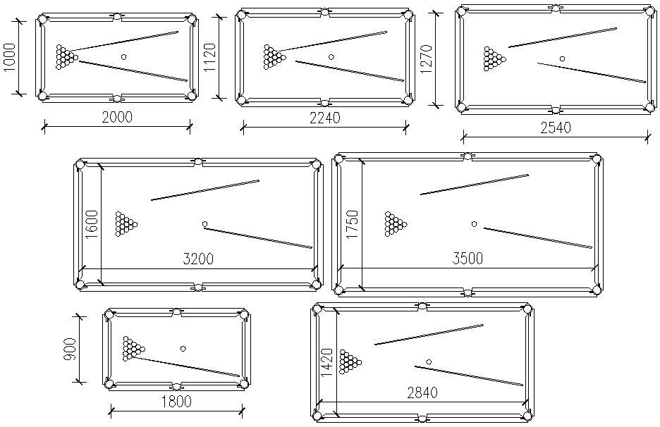 Pool table design drawing that shows top elevation of pool table with pool balls details and pool sticks details.
