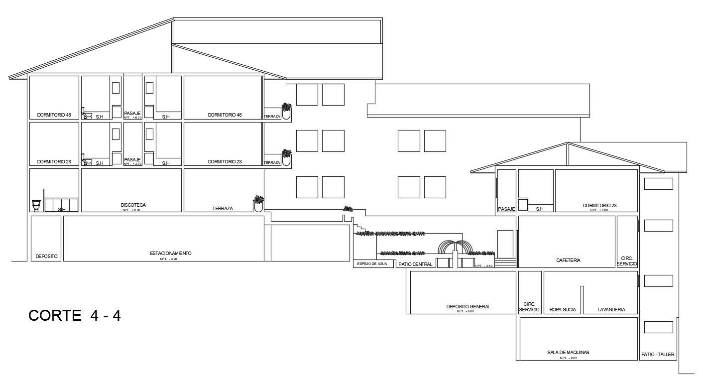 Autocad drawing of hotel building that includes sectional drawing details of hotel building units along with floor level details and leveling.