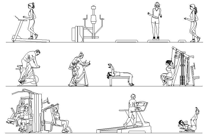 Gym automation blocks cad autocad drawing that shows cross fitter, bike, tread mill, chest presser, and other gym blocks detail drawings.