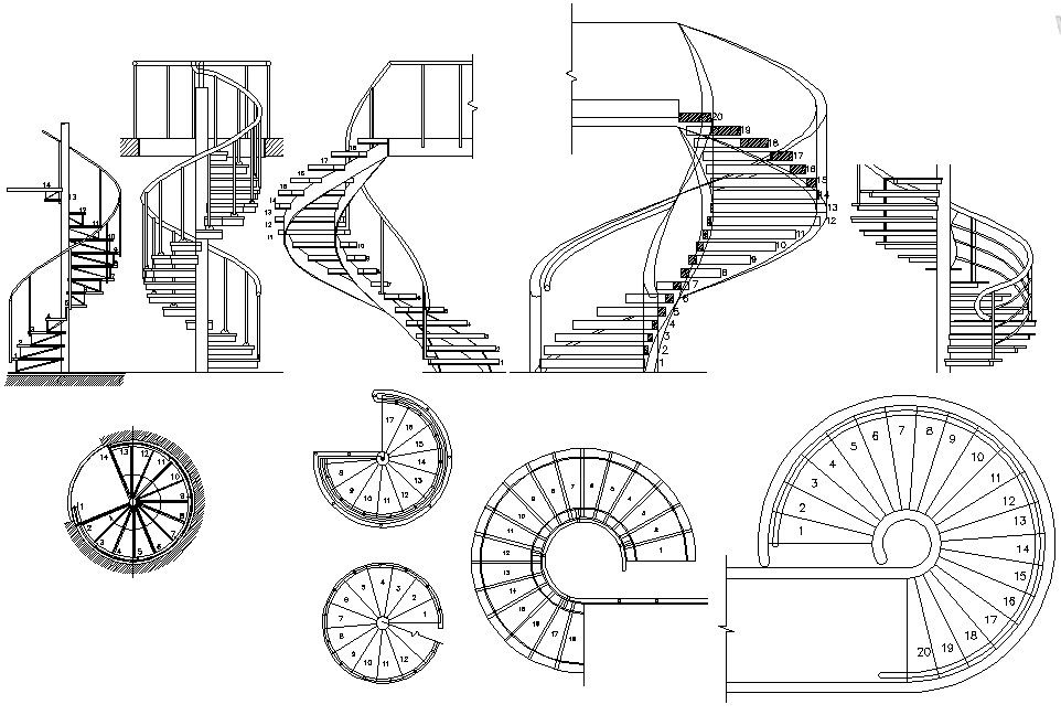 2d Drawing design of staircase construction dwg file that shows spiral stairway design plan along with elevation of staircase. Railing design and riser tread details also included in drawings.