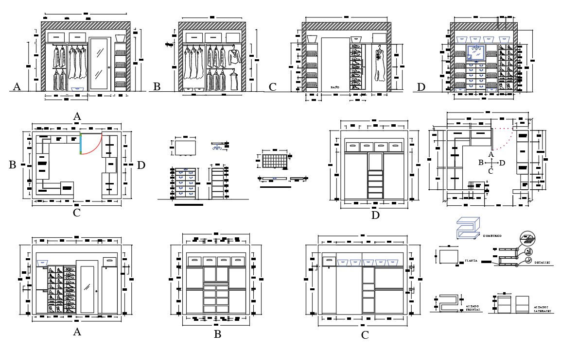 Wardrobe details including a Space for folded clothes, hang long, lady shoes, Drawers, male shoes, constructive details drawer, this file draw in autocad format.