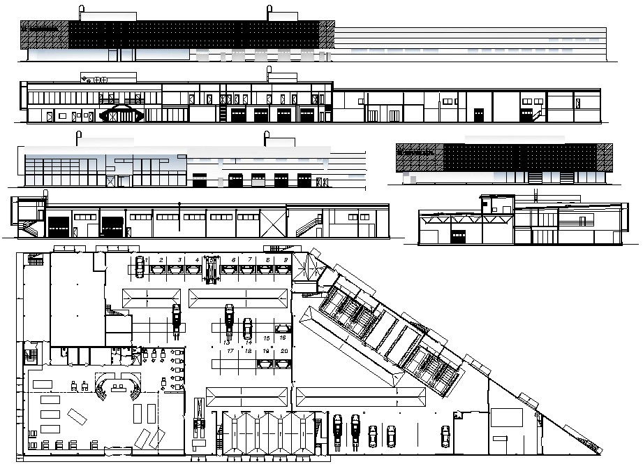 Service Car showroom station DWG file that shows building different sides of elevation with sectional details. Showroom plan details and dimension staircase details with service area details also included in drawings.