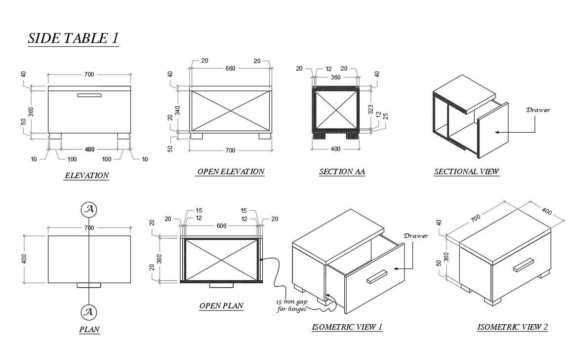 Drawer details proved in a right side elevation plan, section details, isometric view, open plan, back view .