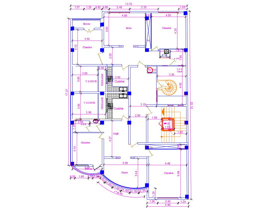 Single storey apartment building DWG file that includes bedroom with attached balcony in it. The dimension of length and width of 17.27m* 13.70m. Staircase for the terrace.