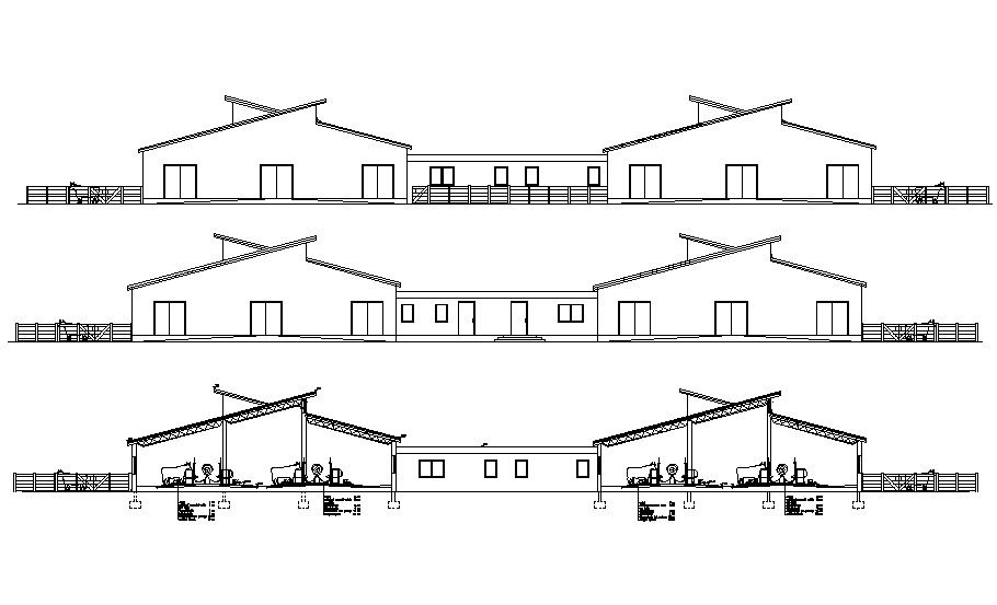 CAD drawings details of Cattle shade elevation and section file that shows roofing structure details at ceiling along with cattle shade elevation and sectional details.