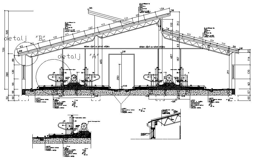 Drawings details of machinery room section dwg file that shows machinery equipment details along with roof shade structure details and dimension details also included in drawing.