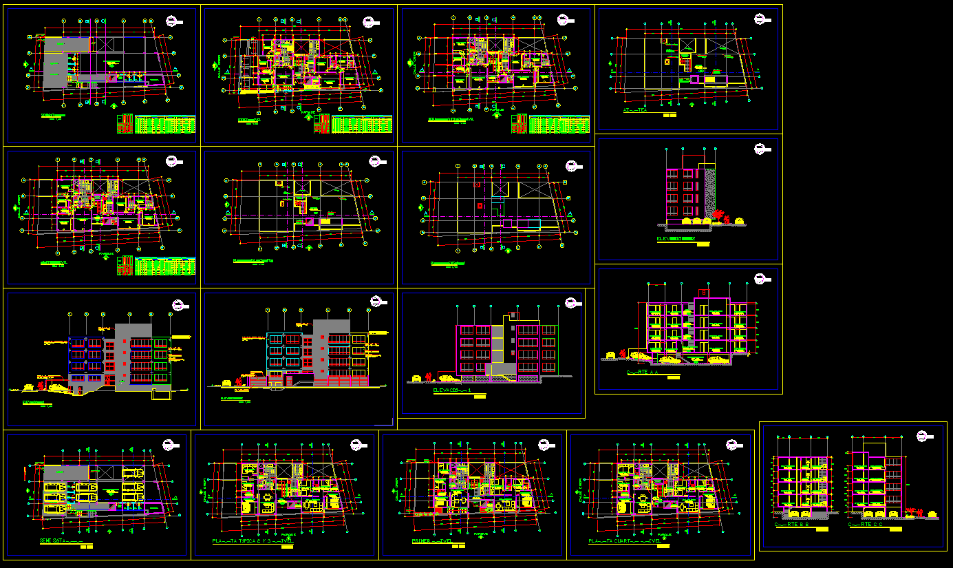 This apartment building AutoCAD DWG file contains a complete set of architectural and structural drawings designed for residential construction. The file includes all floor layouts, basement and terrace plans, as well as detailed centerline and column arrangements. Each drawing offers accurate scaling, making it suitable for project planning, design analysis, and presentation. The plan layout highlights functional residential spaces such as living rooms, bedrooms, kitchens, balconies, and circulation zones that follow an efficient design pattern.