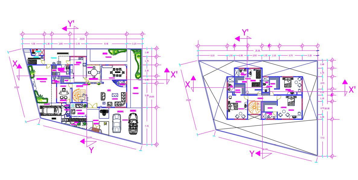 Two storey CAD residential which includes full furnished house with the car parking area. Section details given and open space on the top floor along with the bedroom.