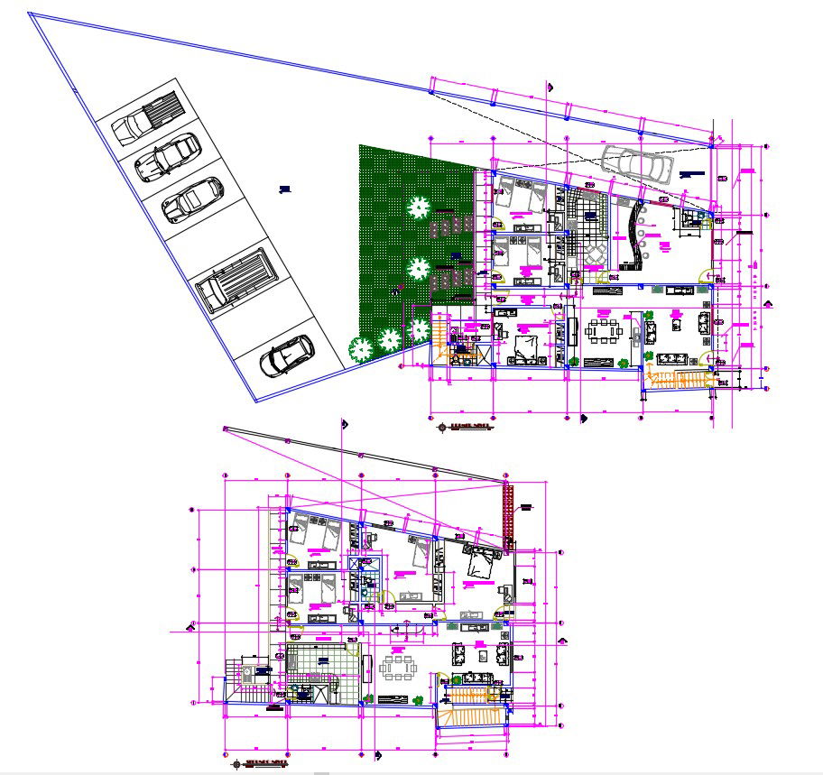 Apartment CAD plan which includes garden area along with the car parking area. Full furnished house with the staircase and compound boundaries included.