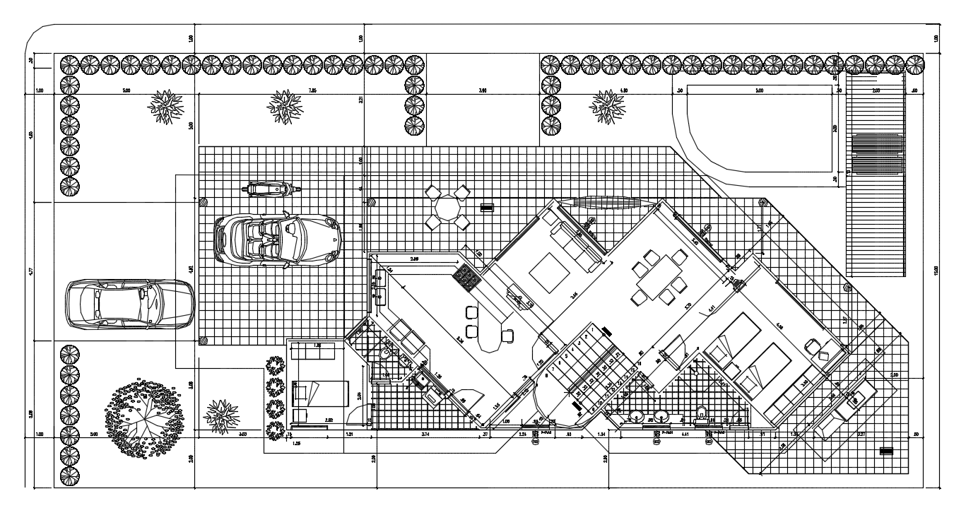 House CAD plan drawing which includes three bedroom with dinning area, kitchen, wash area, and bathroom. Also comprise out door swimming pool area along with parking and landscaping.
