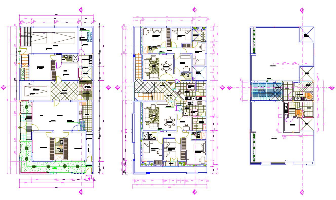 Housing apartment AutoCAD layout plan which shows furnished and unfurnished plan along with the terrace plan. Single storey house with details of dimension, section line and hidden line details also shown in drawing.