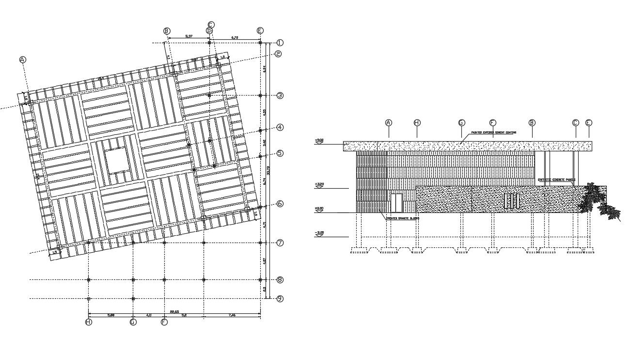 Roof plan and building elevation drawings in DWG file that shows roofing structure plan details along with dimension details and building side elevation details.