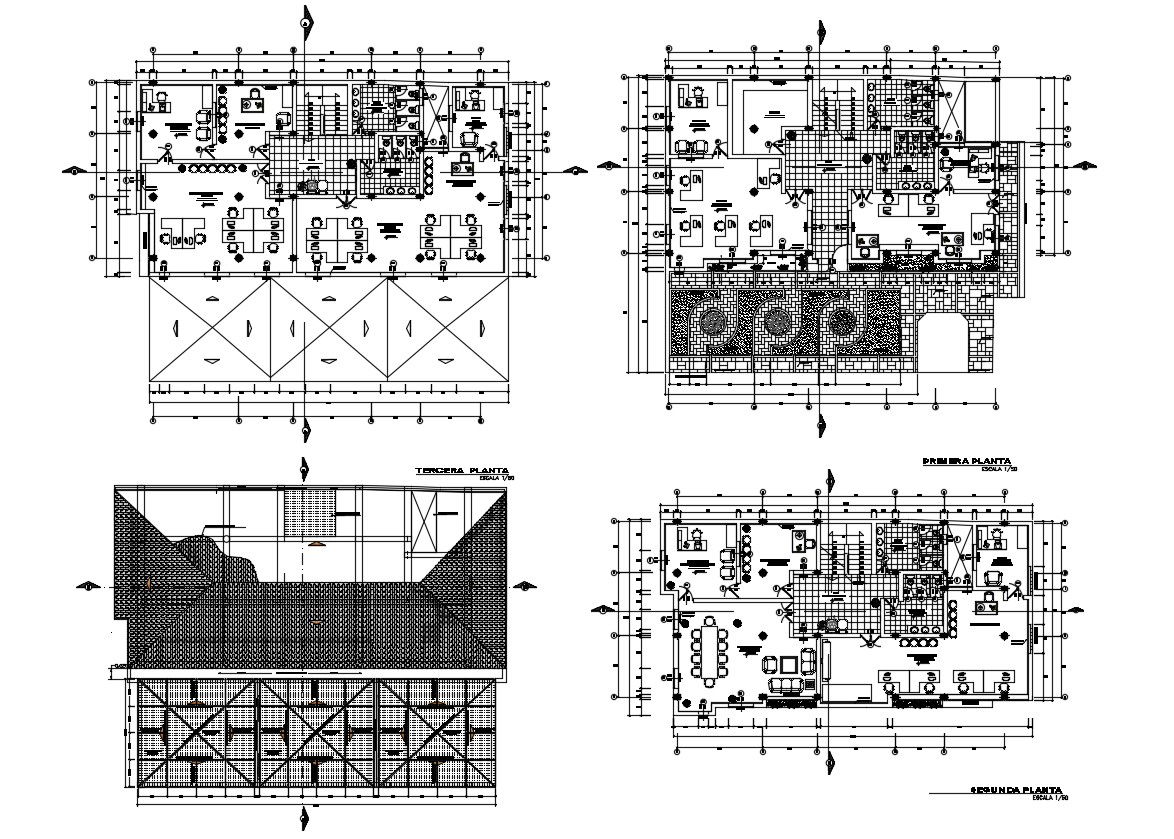 CAD plan of municipal office building file that shows work plan drawings details of building with furniture layout details in building. Dimension, hidden line, section line details with floor level details room cabins details also included in drawings.