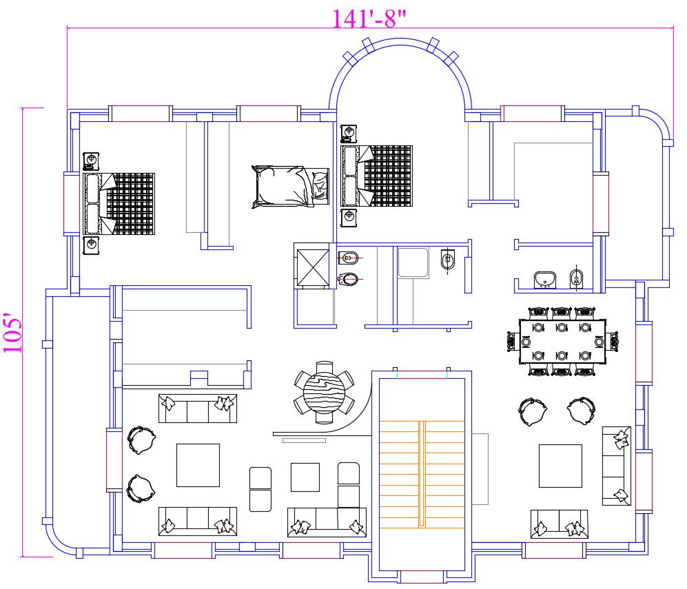 Semi furnished cabana autocad plan which includes three bedroom, two living room along with two dinning table, bathroom, and kitchen. The dimensions of the house is in length and breadth 105’* 141’8”.