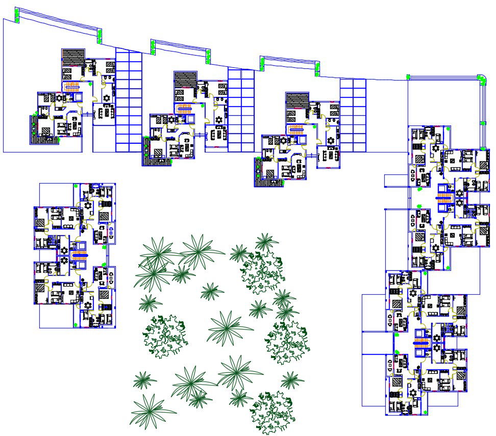 Residential living apartment cad file which includes individual house plan with fully furnished house. Along with parking area in each and every house with landscaping.