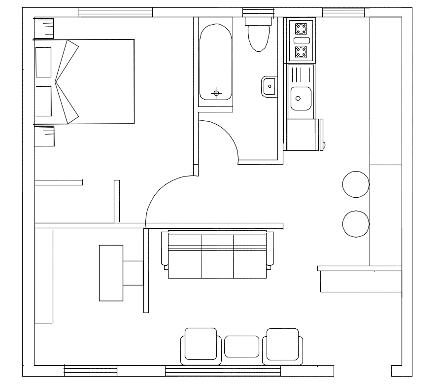 1bhk house plan full furnished drawing which includes one bedroom, bathroom, kitchen, and TV hall. Floor level details included.