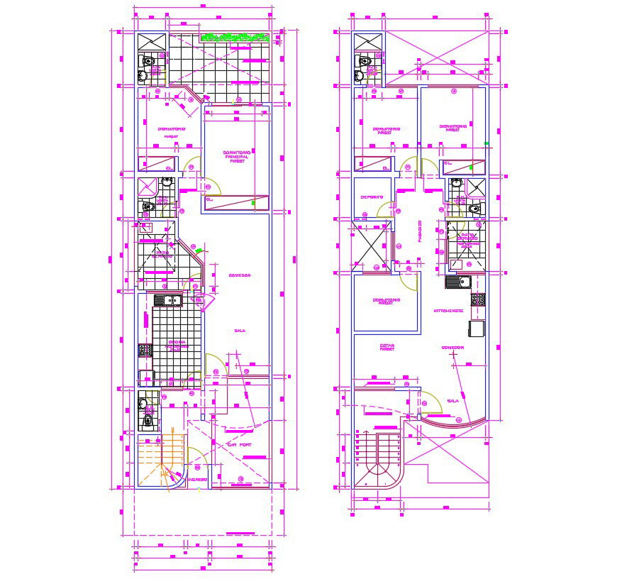 Two storey building cad plan which includes bedroom, kitchen, washroom, wash area, garden at the back. The first floor includes bedroom, balcony, bathroom, living area.