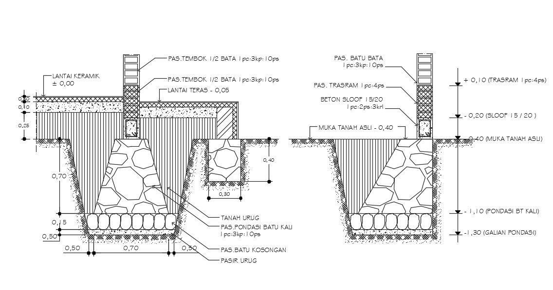 Drawings details of RCC structural blocks 2d view DWG file that shows foundation footing details with concrete masonry and stone masonry details. Reinforcement details are provided in tension and compression zone with DPC layer details and the structure is a reinforced concrete cement (RCC) structure.
