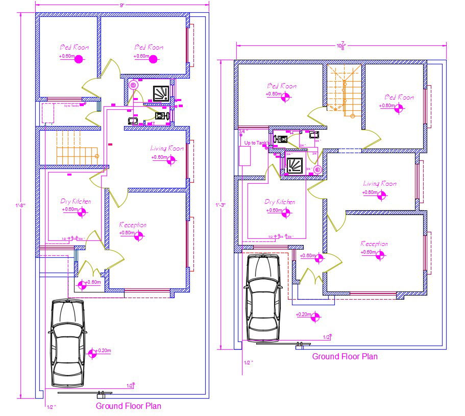 Two different options of ground floor plan which includes bedroom, living room, parking area, bathroom, and kitchen. Both ground floor include same details.