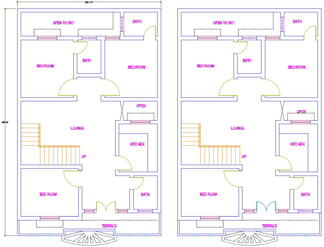 2d apartment cad plan consists of bedroom, lounge, bathroom, kitchen, and terrace. In both of the floor these details are there.