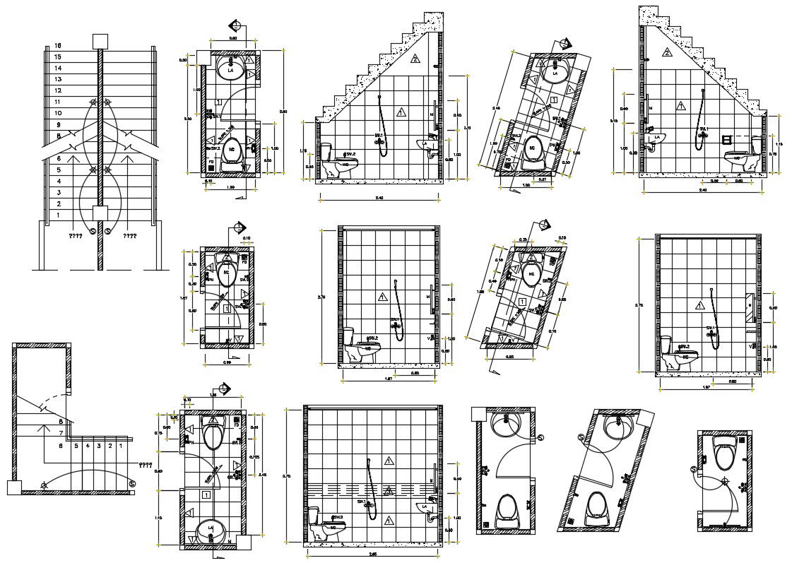Sanitary toilet CAD plan and section Drawing that shows sanitary toilet layout plan along with sanitary blocks details of washbasin, water closet, shower details and sectional details of sanitary toilet is also shown in drawing.