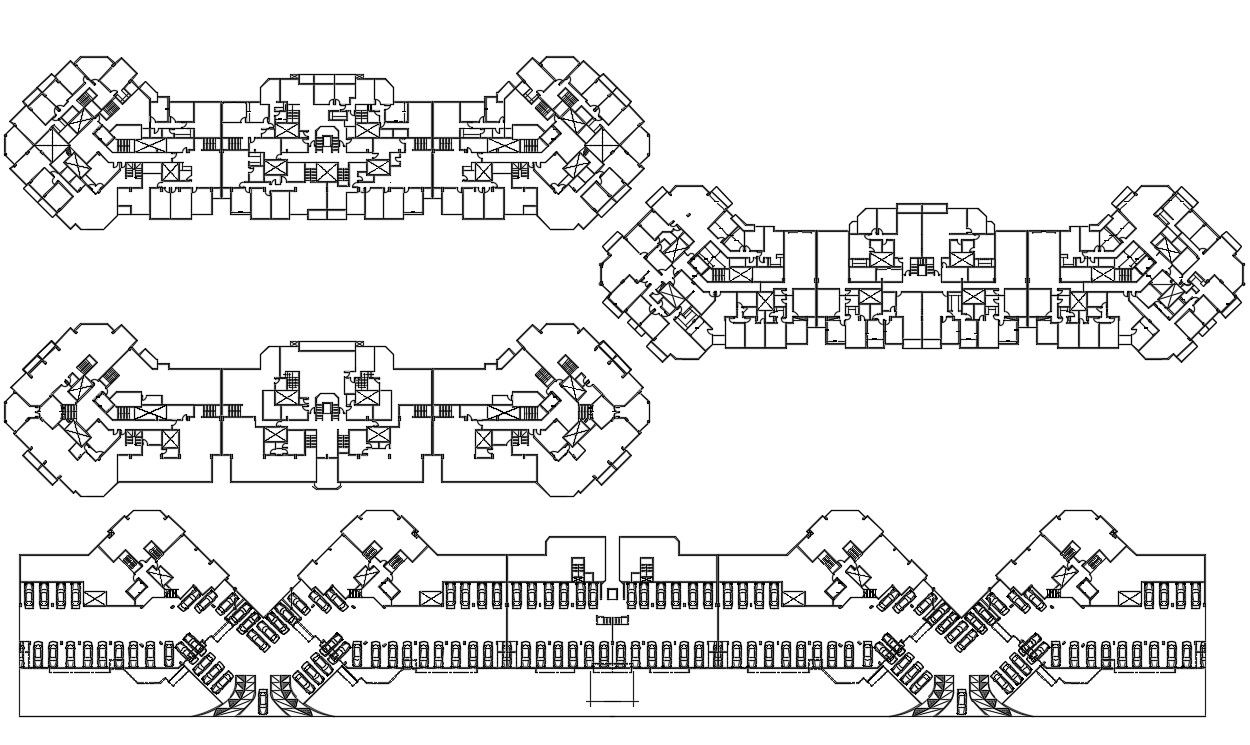 Commercial building hub CAD file download that shows work floor plan drawing details of building along with floor level details and staircase details. Basement parking space area details and 90 degree parking system details are provided within the building premises.