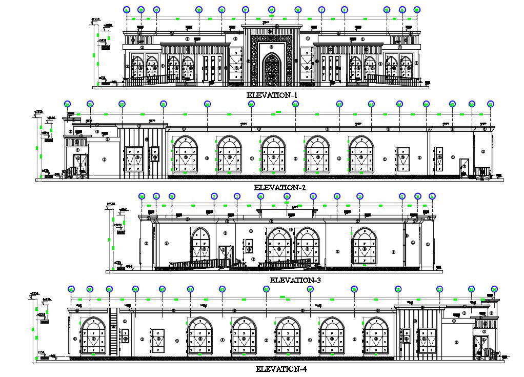 Single story building elevation CAD drawing that shows building different sides of elevation like front elevation side elevation and rear elevation. Floor level details and leveling details also included in drawing.