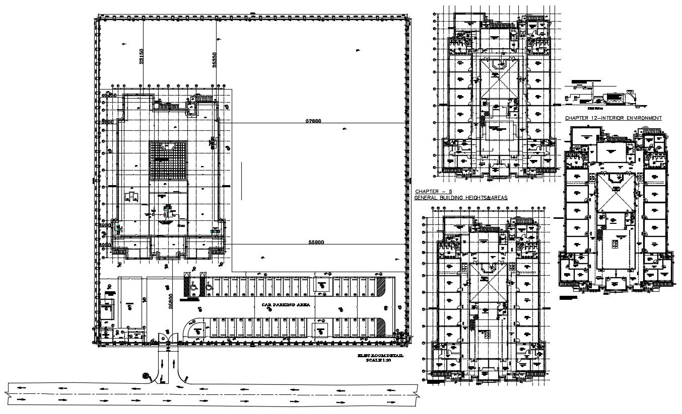 Commerce building CAD drawing that shows work floor plan drawing of building along with area details and parking space details.Building dimension section line and hidden line details also included in drawing.