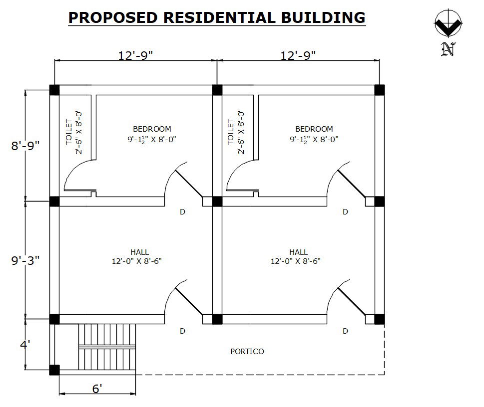 One bhk housing CAD drawing download that shows detached apartment floor plan along with hall and bedroom details. Room dimension details along with bedroom attached sanitary toilet and bathroom details also included in AutoCAD drawing.