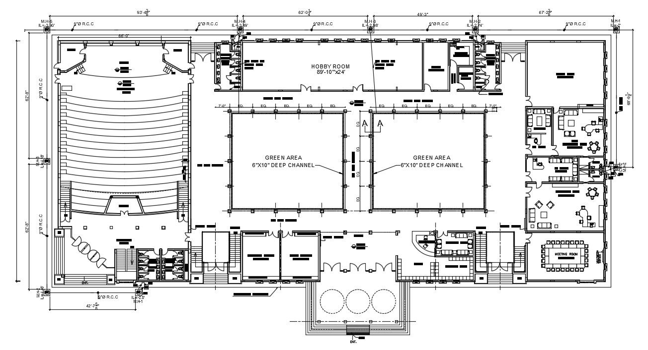 The architecture school building ground floor layout plan includes an auditorium, meeting room, bathroom, deep channel area, admin office and principle cabin with furniture arrangement. also, include all dimensions and description detail of School Building Plan DWG File