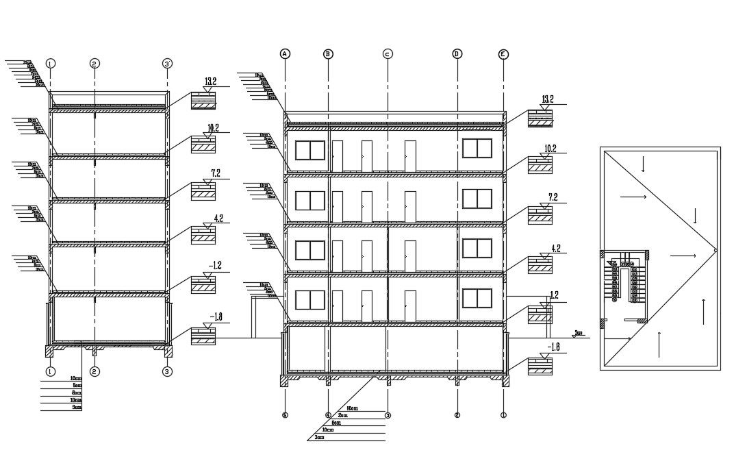 Apartment section and terrace plan CAD drawing download for free that shows apartment sectional details along with floor level details and terrace plan details. Staircase and leveling details also included in drawing.