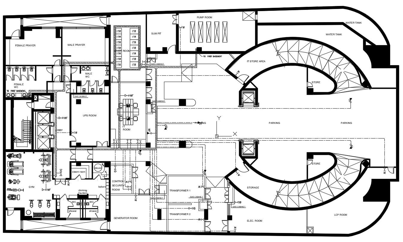 2d Drawing of multi-use commercial building CAD file that shows work plan drawings details of commercial building along with floor level details and stores details. Store details, restaurant area, sanitary toilet area, gym area details, Security room, pump rooms and other room details also included in building complex.