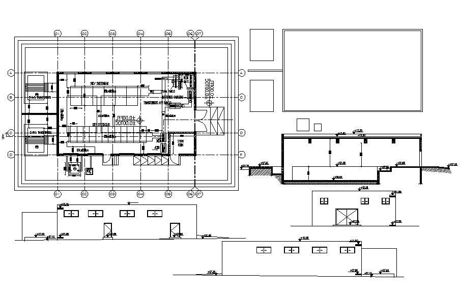 Transformer room plan and section CAD drawing that shows room floor plan drawing along with electrical machinery units details and room elevation sectional details also included in drawing.