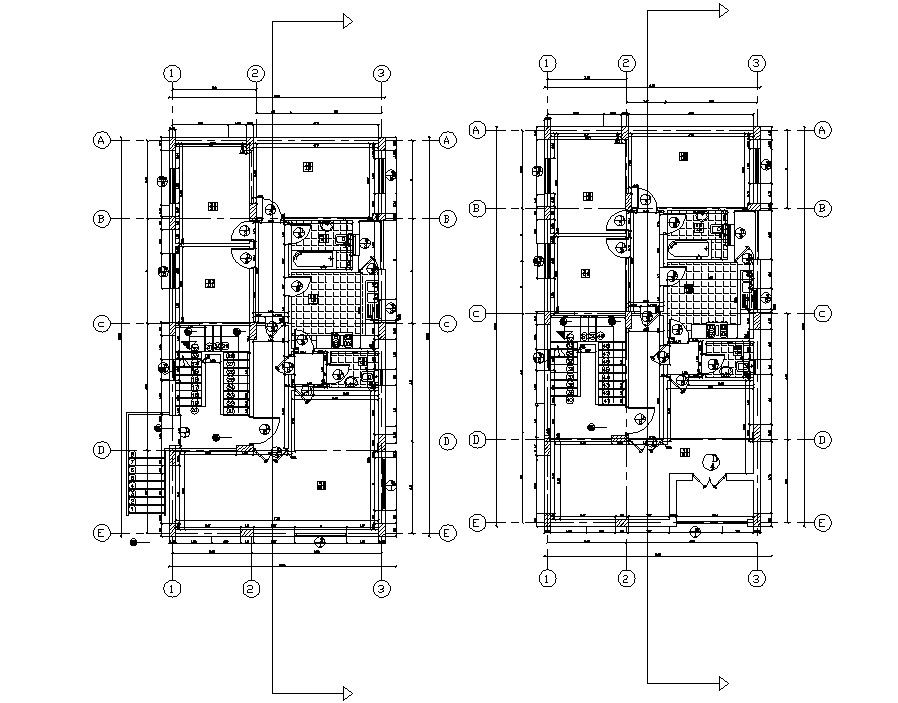 Two story House CAD drawing download that shows floor layout design plan of house along with floor level details and dimension hidden line details. Section line details and staircase details also included in drawing.