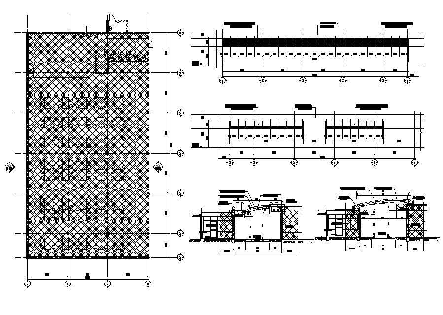 Architectural plan and sectional drawing of commerce building DWG file that shows work floor layout plan drawing details of building along with dimension hidden line details.Section line details along with sectional details of building structure also included in drawing.