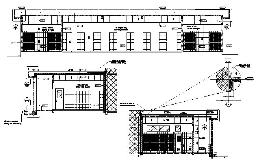 Elevation and sectional drawing of multipurpose hall CAD file download that shows building front elevation details and sectional details of building.