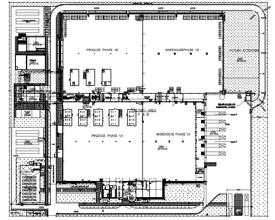 CAD industrial Warehouse plan design DWG file that shows work floor plan of industrial warehouse along with internal dimension and other blocks details.