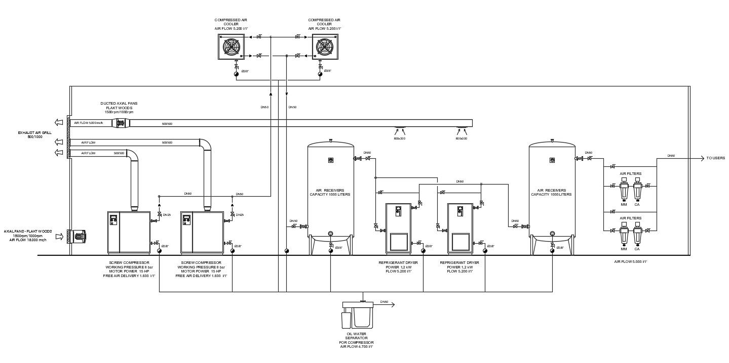 Factory Machine Drawing CAD file includes air compressor, refrigerant dryer, and screw compressor